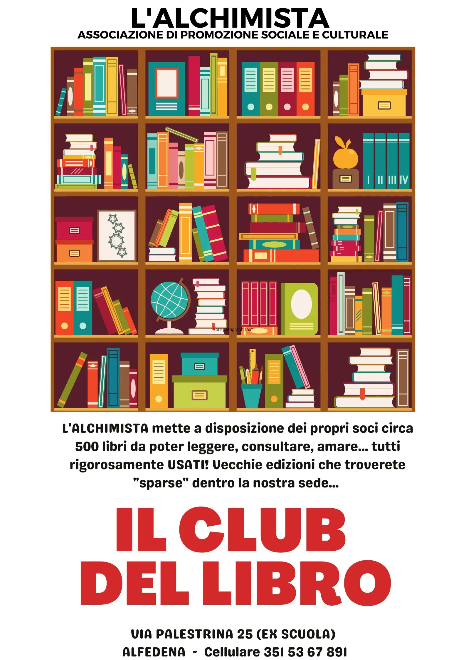 L’ALCHIMISTA ha messo a disposizione dei propri soci da settembre 2023, circa 500 libri da poter leggere, consultare, amare. Tutti rigorosamente USATI! Vecchie edizioni che troverete “sparse” dentro la nostra sede. Nel tempo contiamo di ingrandire la biblioteca dei libri.