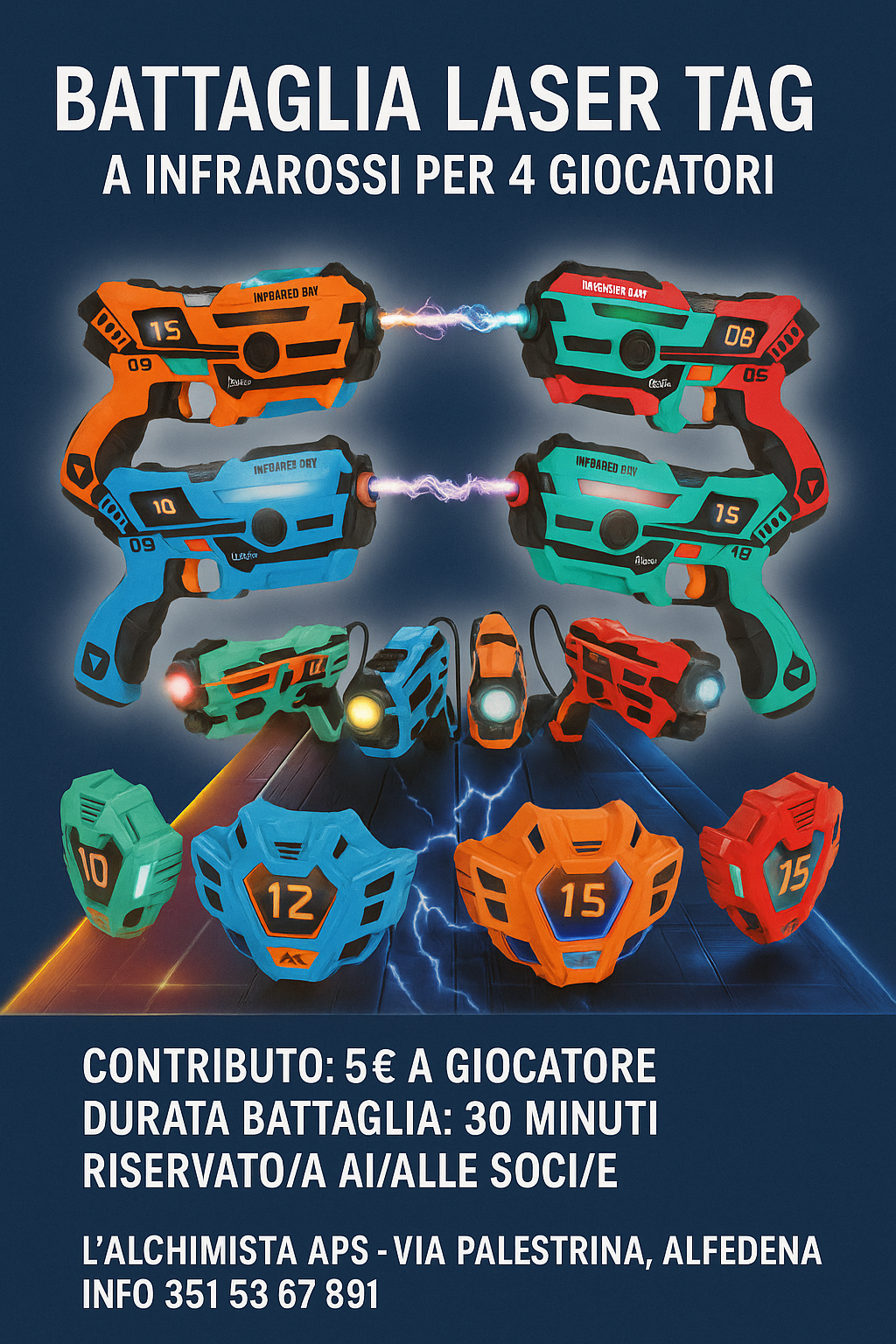 All’interno de L’Alchimista arriva il nuovo Laser Tag a infrarossi: adrenalina pura in una sfida pensata per 4 giocatori, con pistole laser ad alta precisione e pettorine elettroniche che registrano ogni colpo. Due squadre da 2 si affrontano in duelli coinvolgenti, immersi in luci, suoni e tensione da vera battaglia futuristica!