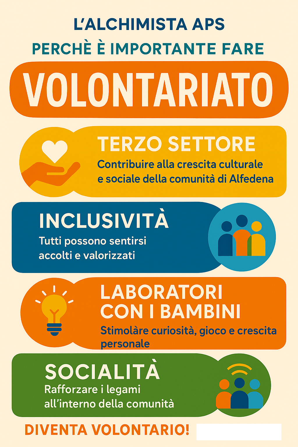 Fare volontariato con L’ALCHIMISTA APS significa contribuire in prima persona alla crescita culturale e sociale della comunità di Alfedena. L’associazione opera nel Terzo Settore, ambito fondamentale per rafforzare la coesione sociale e promuovere valori di solidarietà, inclusione e cittadinanza attiva.